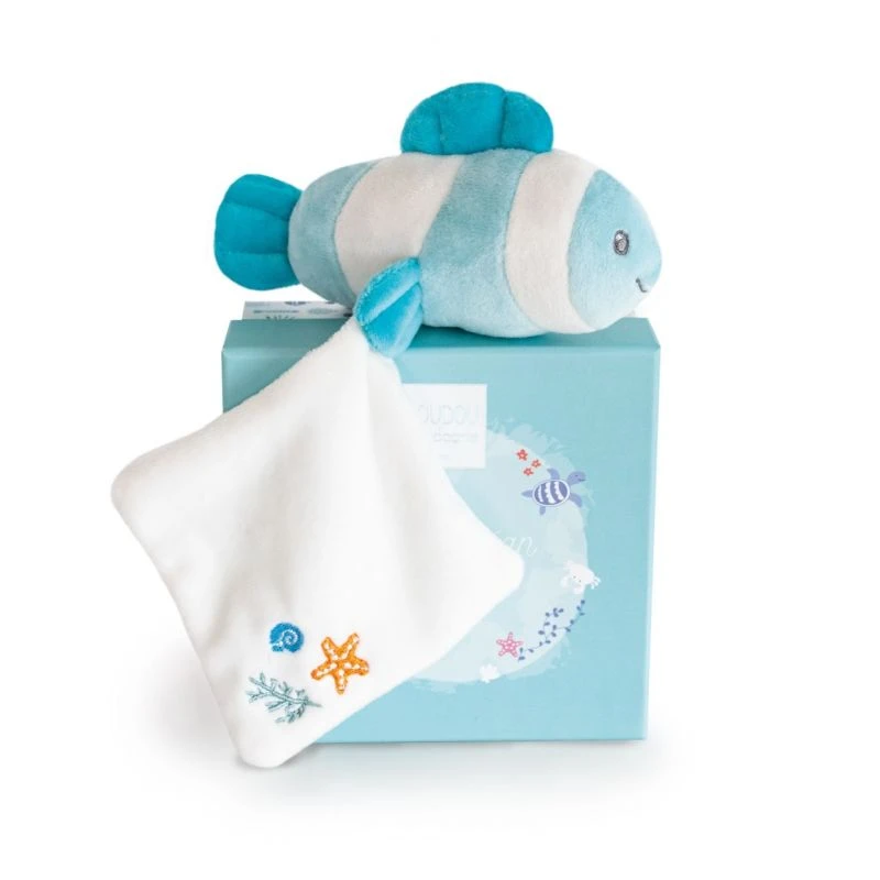 Une jolie peluche poisson vert Doudou et compagnie avec son doudou, vendue dans une jolie boîte.